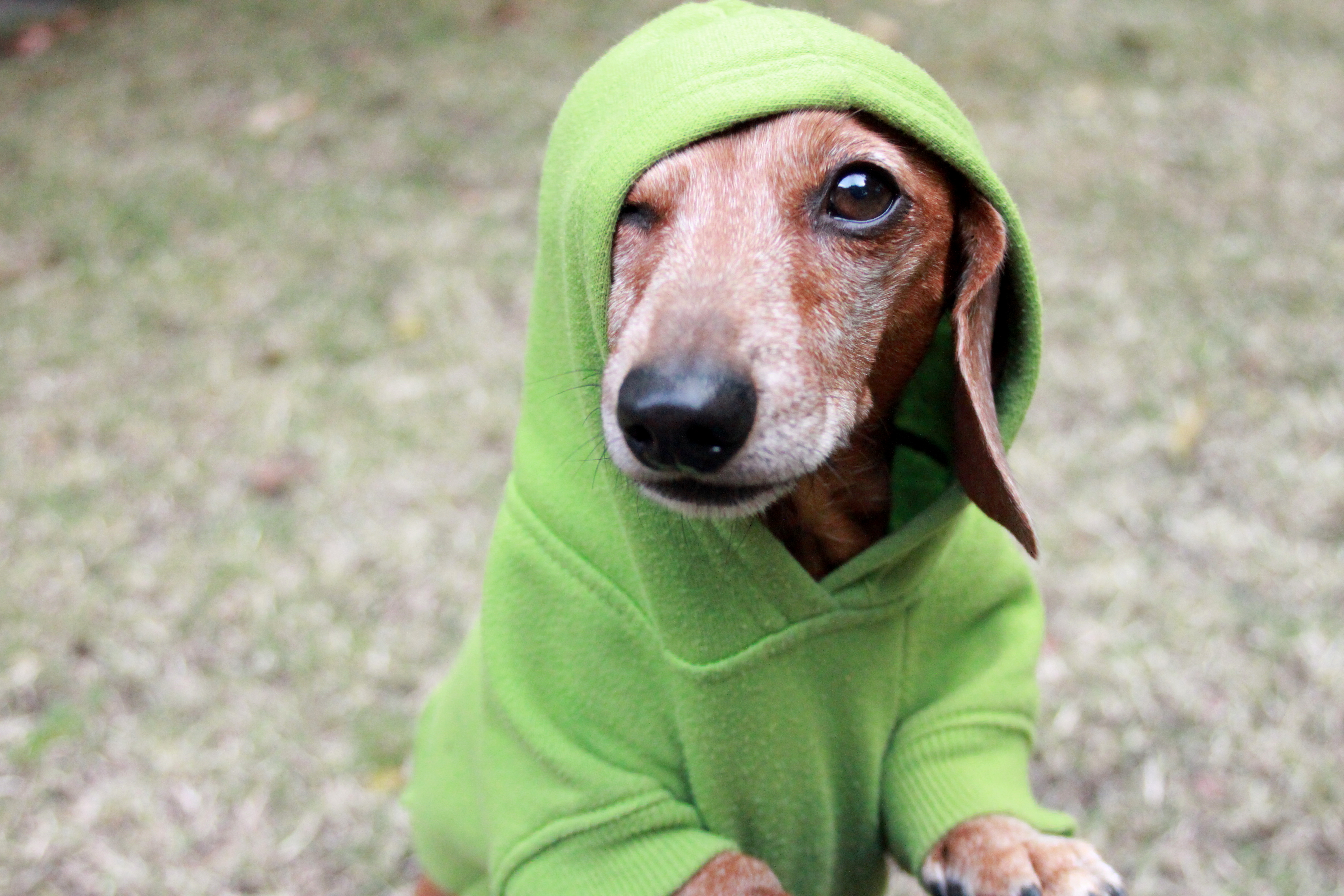 Living in Southern California our winters are pretty mild, but on occasion Rufus needs a little extra warmth. When clothing shopping for a low-riding doxie, I often look for something that is wash and wear, covers his underbelly to keep him dry and clean, and has no or short sleeves. Rufus’ green Zack and Zoey hoodie was a real unexpected find and has only gotten better with wear. For more info on Rufus’ green hoodie click here.