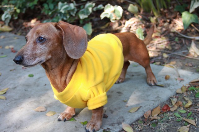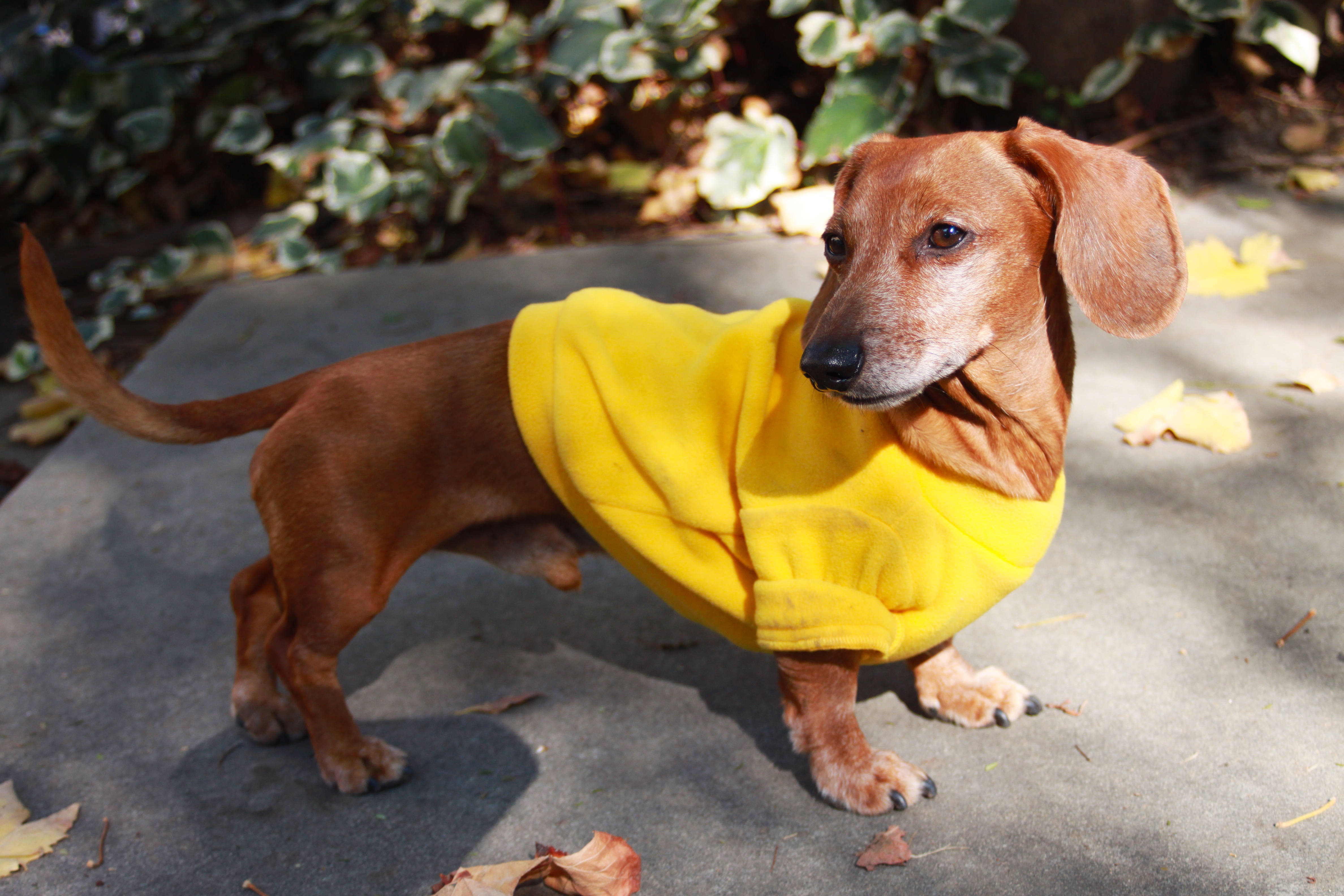 Following the Brad Goreski trend of introducing pops of color to your wardrobe, Rufus sports his 1980s Jennifer Beals Flashdance inspired sweatshirt. Big thanks to Joy Brunn from Dachshund Rescue and Placement for the great gift.
