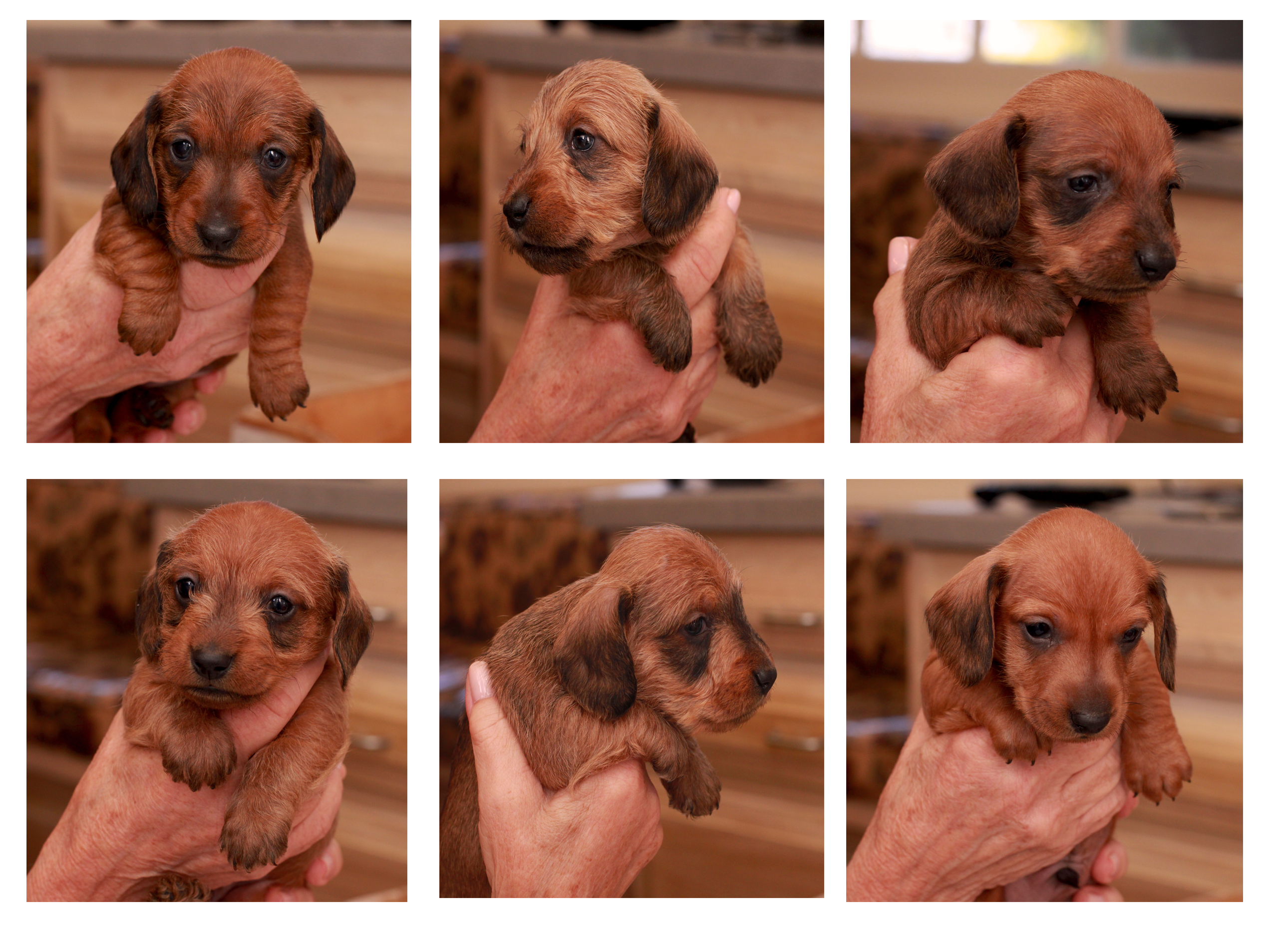 Our friend just had a litter of puppies. Grand Champion Winfall Social Butterfly “Sophie” gave birth to 6 healthy puppies on January 4, 2012. Sired by another miniature wirehair champion named Clark, the puppies are already champions of cuteness in my book.