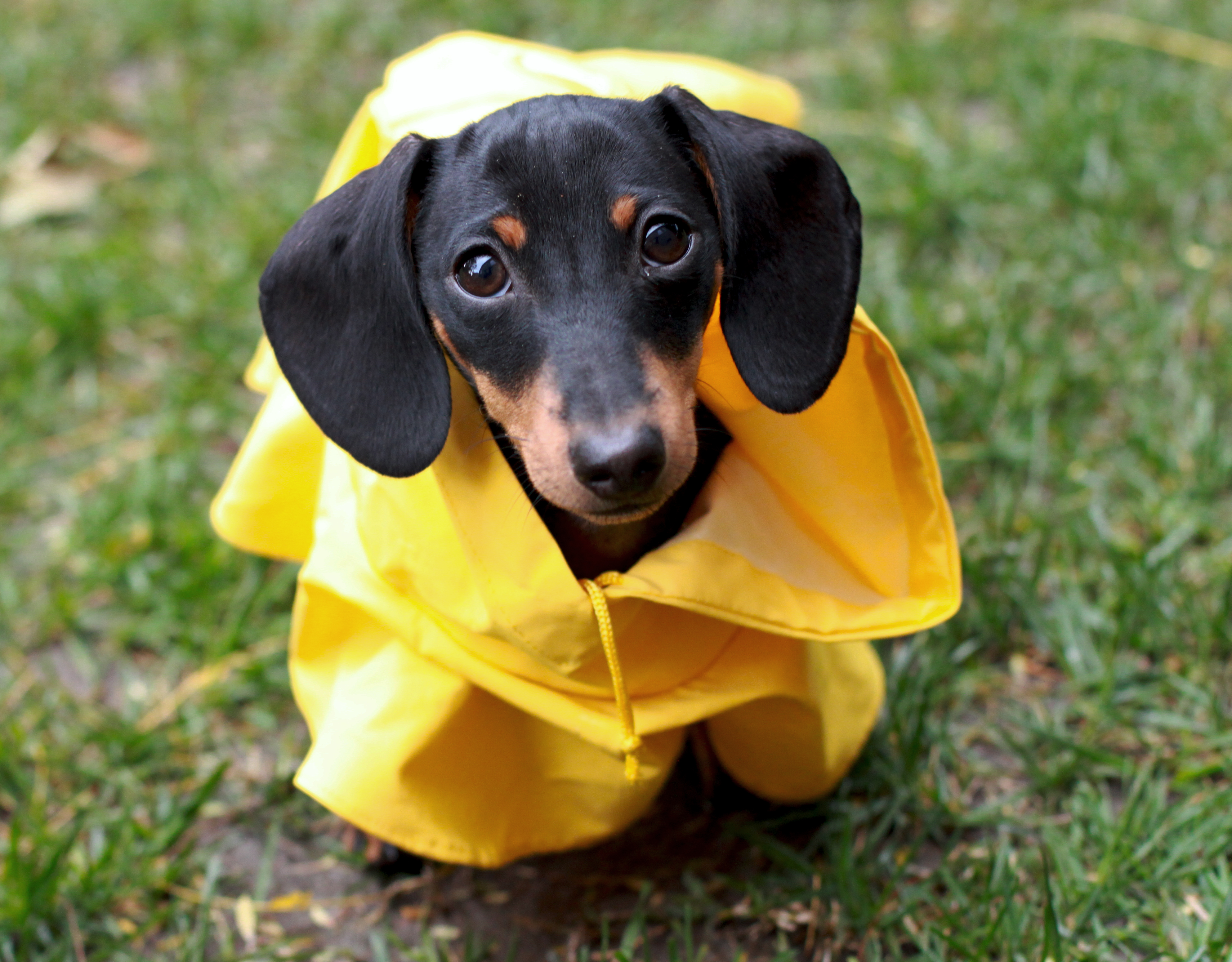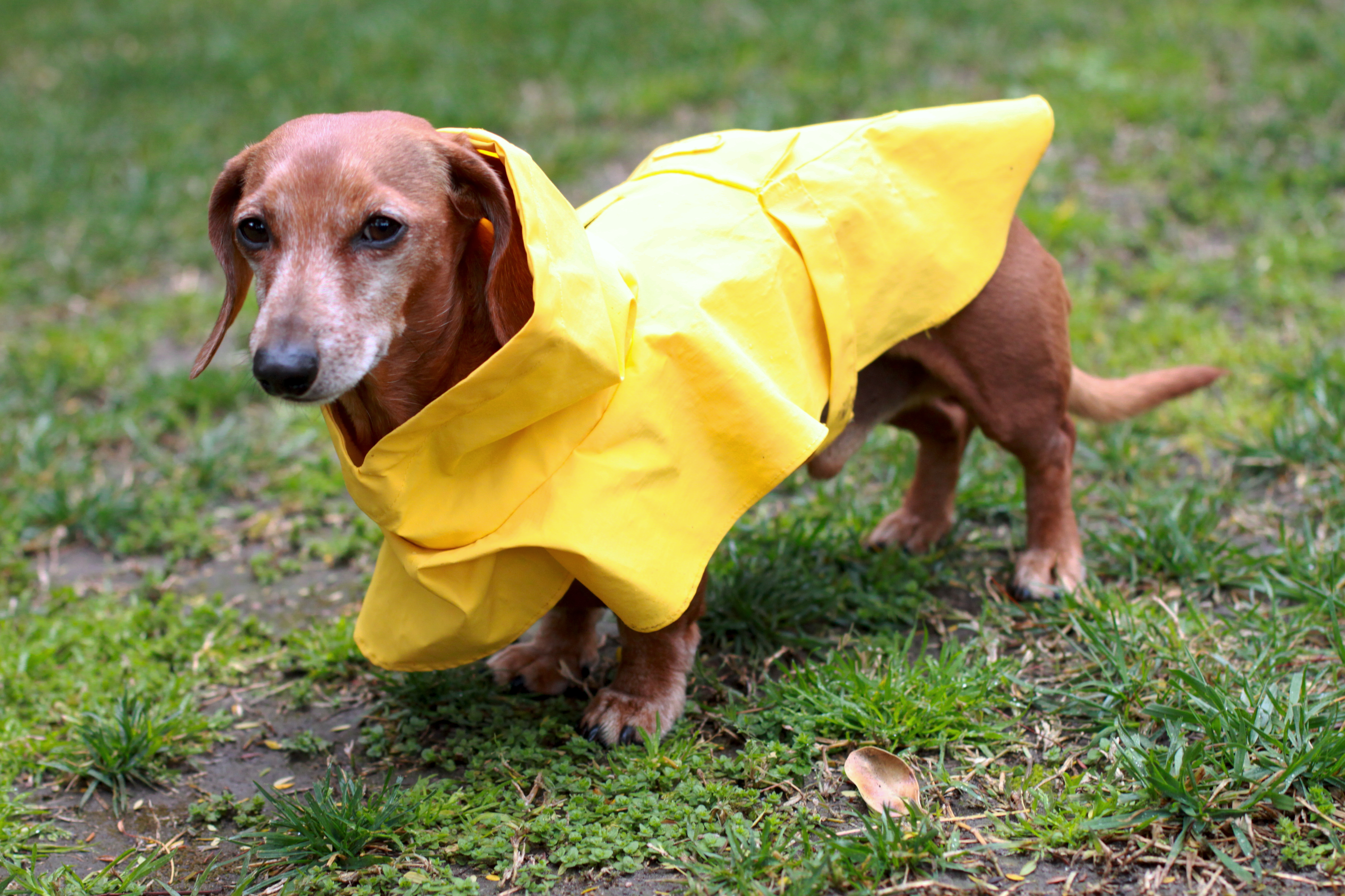 This Sunday it was a torrential downpour in Los Angeles and Emily’s first. Living in Southern California rain comes sparingly, thankfully. Yesterday the rain was constant, and Angeleno doxies reject the notion that they must go outside when it’s wet. So we waited and waited for a break in the storm. When it finally came late afternoon we raced to the grass and Emily tried on Rufus’ rain poncho. It was naturally too big for her, but made for a fun sight nonetheless. Proof is in the picture.