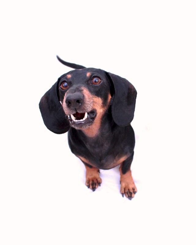 Abbey, the black and tan smooth doxie, was a real character when I photographed her last year. She would bark when I would hold a treat, which made for some fun photos. I caught her mid-bark with her mouth in between open and close in the top photo; she reminds me of vampire doxie, if there was ever such a thing. In the one below, I simply love the outline of the dachshund form – which is probably one of my signature dachshund poses. Abbey is a rescue and was estimated to be 4 at the time of the photos.