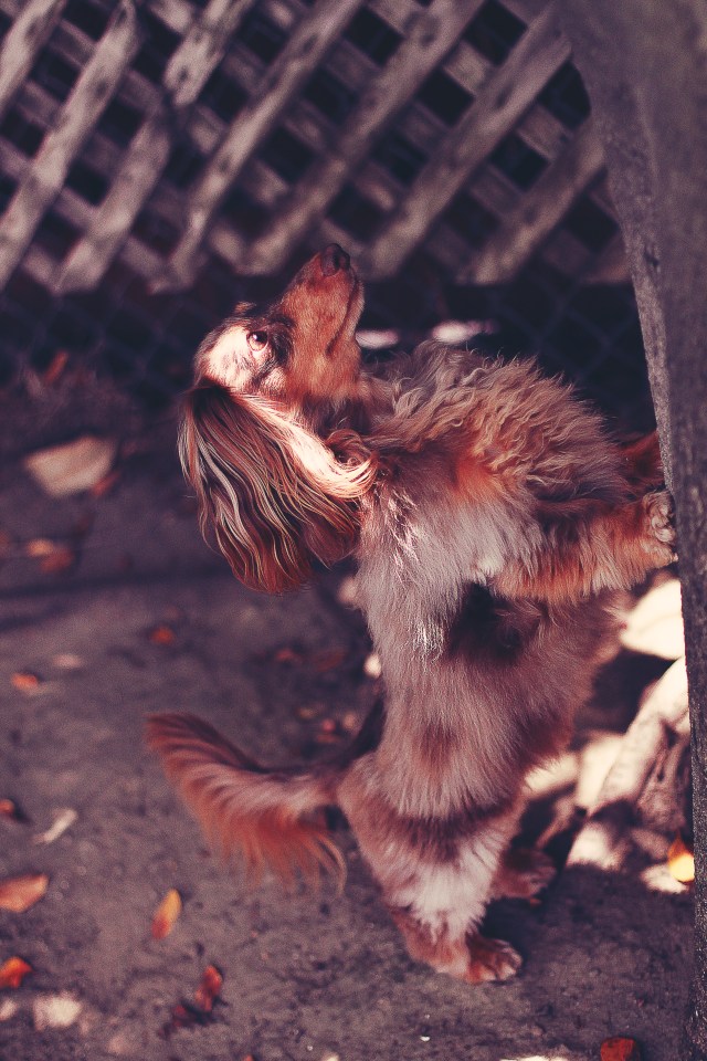 I’ve known Leo, the adorable longhair dapple chocolate, for several years now; I remember when his parents first rescued him how shy and apprehensive he was. Recently I got to doxie-sit Leo and his brother Polie for a day, and Leo is significantly a more confident doxie today. He may never be the bold dachshund his brother is, but it was certainly a joy to watch him with his tail erect and head held high as the self-assured Leo explored and guarded the backyard. For me, it’s amazing to witness the evolution, and I attribute his measureable progress to his devoted parents. Great job!!!