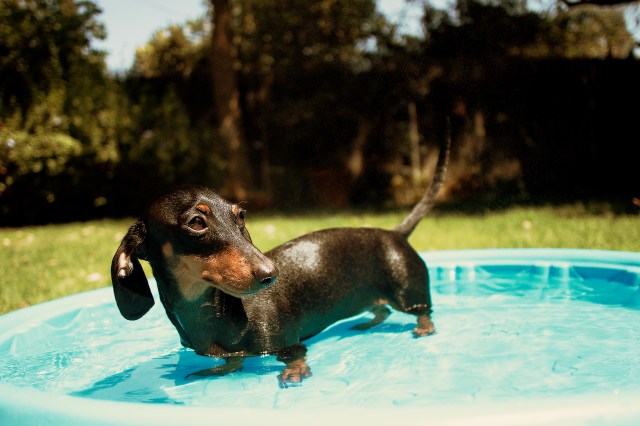 Wow, triple digit heat hits Southern California. Keeping cool can be challenging but not for Ms. Emily Sue. Unlike Rufus who shows little interest in the kiddie pool, Emily loves it! She can’t really swim in it, but I believe she finds it very refreshing. She’ll happily soak in it for several minutes at a time and then get out and run around the yard like a crazy doxie. She then sunbaths herself dry before coming inside to the comfort of air condition. She even enjoys the water mister during her soak. Stay cool doxie friends!