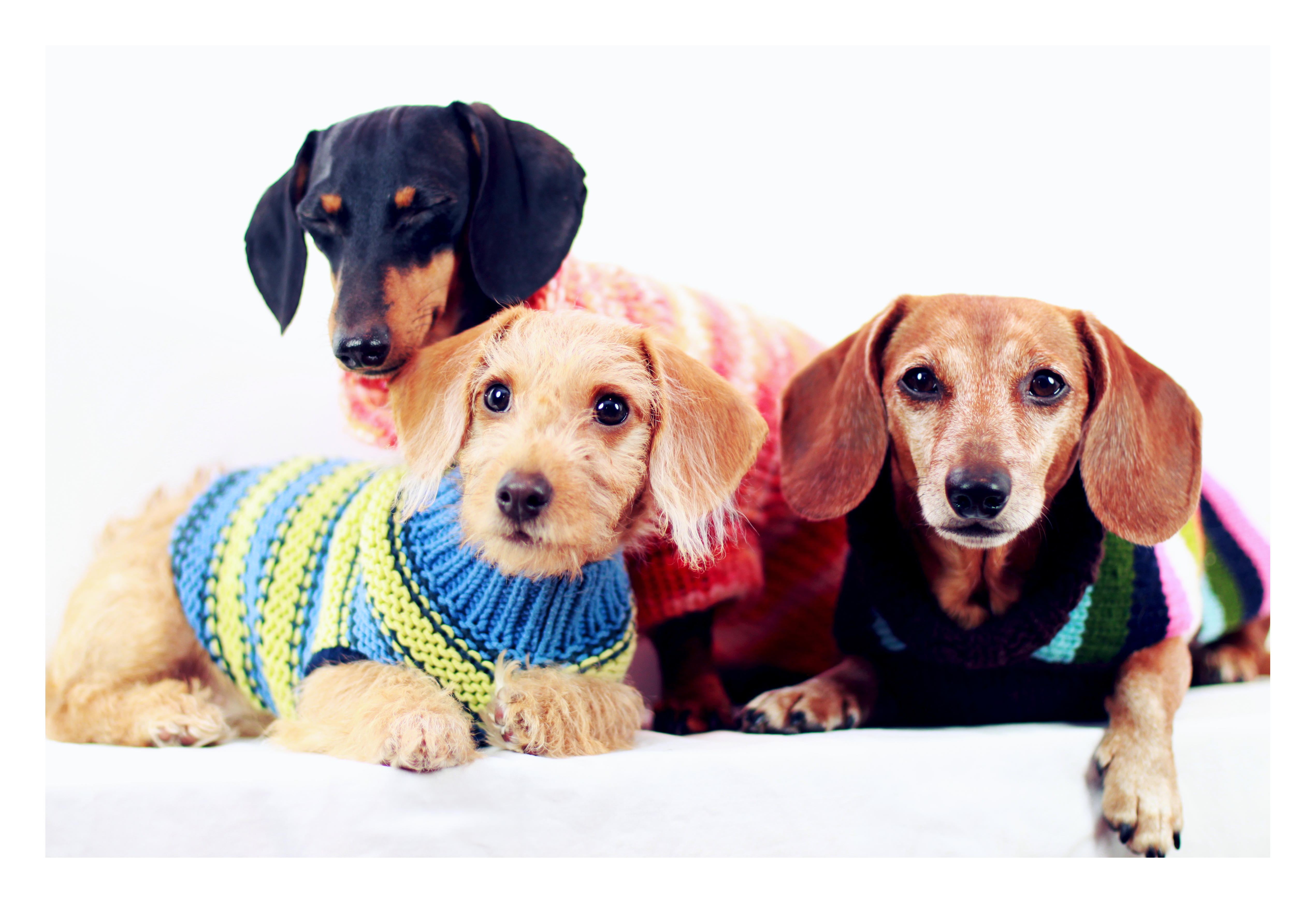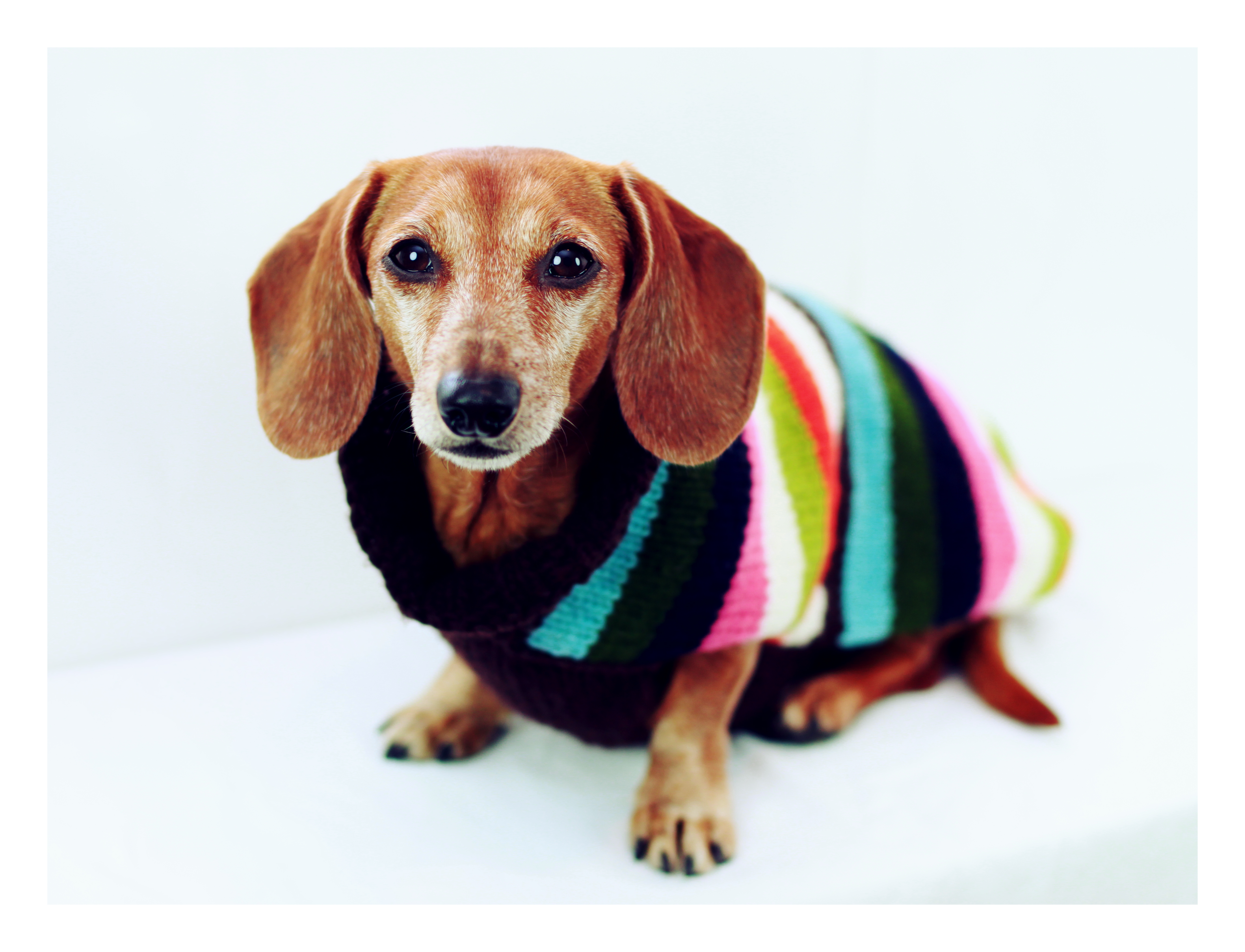 When we’re home cuddling on the couch on these cool desert nights, I like to put my dachshunds in a chunky warm sweater. The sweaters are not great for mobility, but perfect for sitting on the sofa watching TV or visiting with friends.