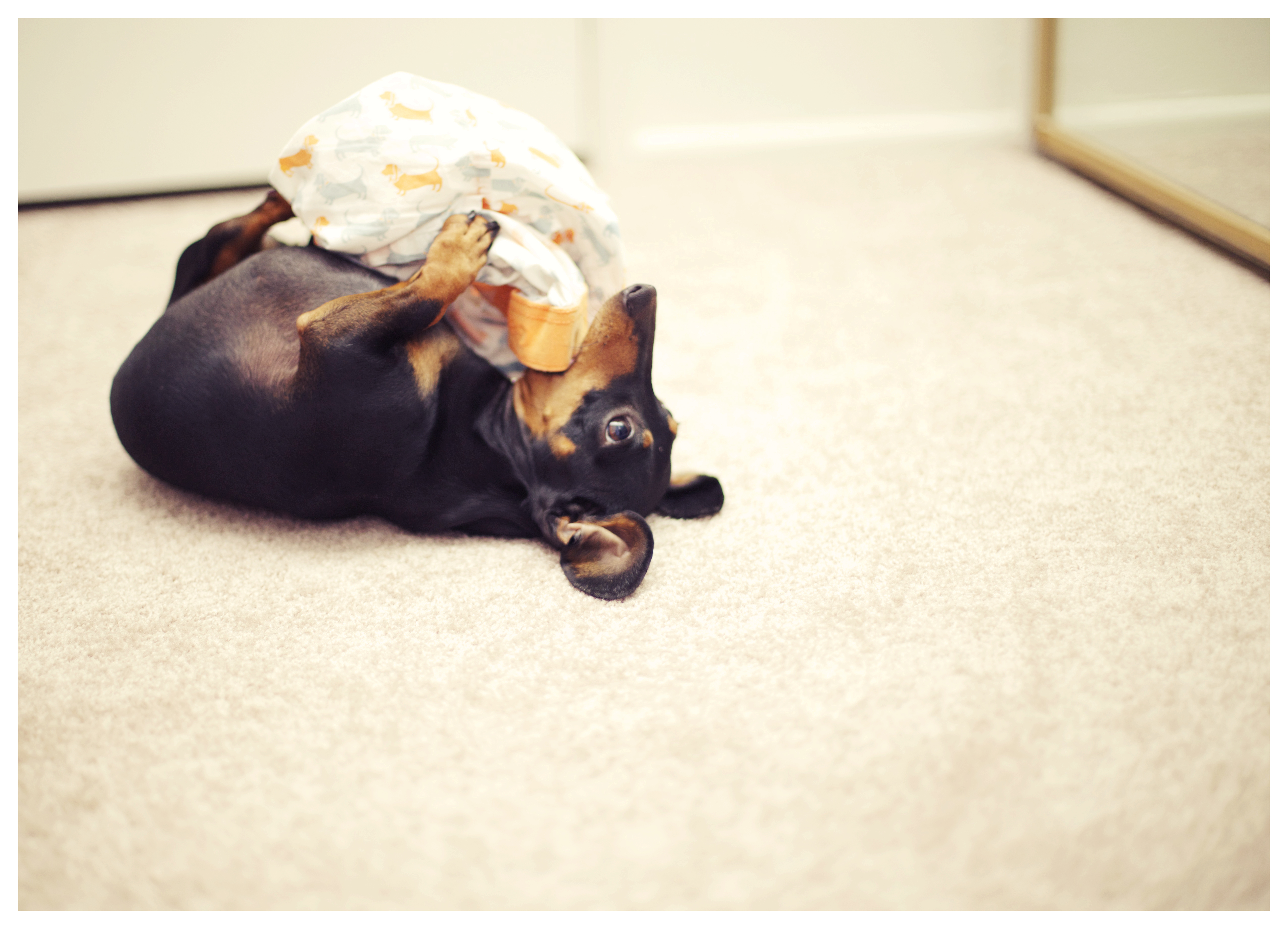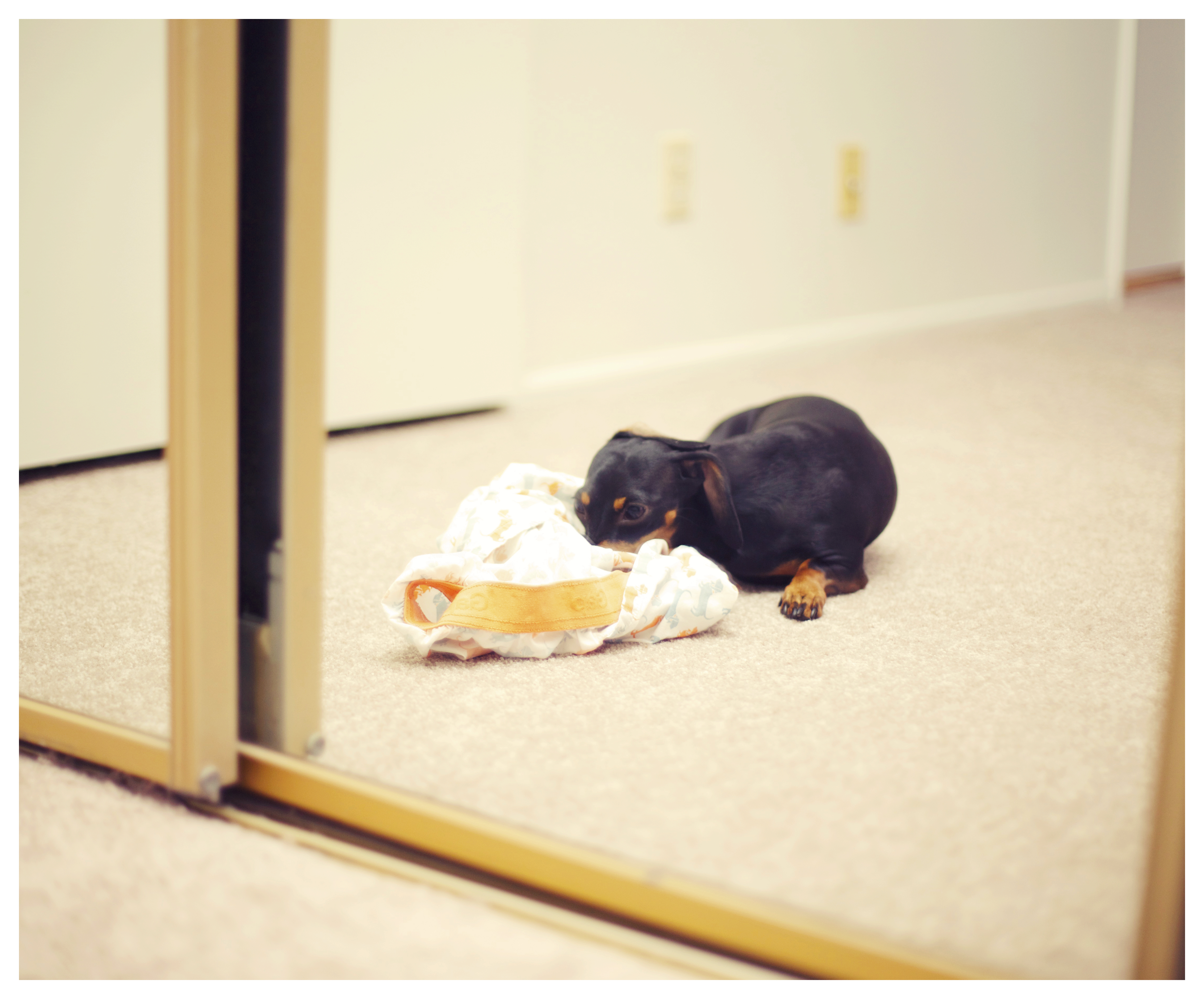 Emily continues to crack me up and I suspect many of you doxie humans can relate. Emily loves to play with laundry; she’s not very discriminating because she’ll play with clean or dirty laundry. As I mentioned earlier this week, Emily also loves to bark at her reflection in the mirror. When you combine the two: her love for laundry and barking at her reflection, you get today’s post. Emily entertaining herself and us.