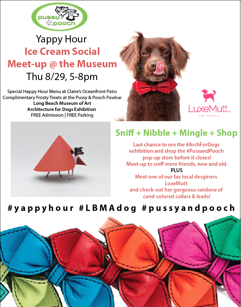 Every dachshund needs her debut and this Thursday (tomorrow) at the Long Beach Museum of Art, Lily will have hers. Lily and her complete pack will be attending the Pussy and Pooch sponsored Yappy Hour Ice Cream Social. If you’re in the area please come out and say hi. This is an on-leash event and all are welcome. Our good friends from LuxeMutt will also be in attendance, and we love well-made collar and leash. Come on out if you can. Love to see you.