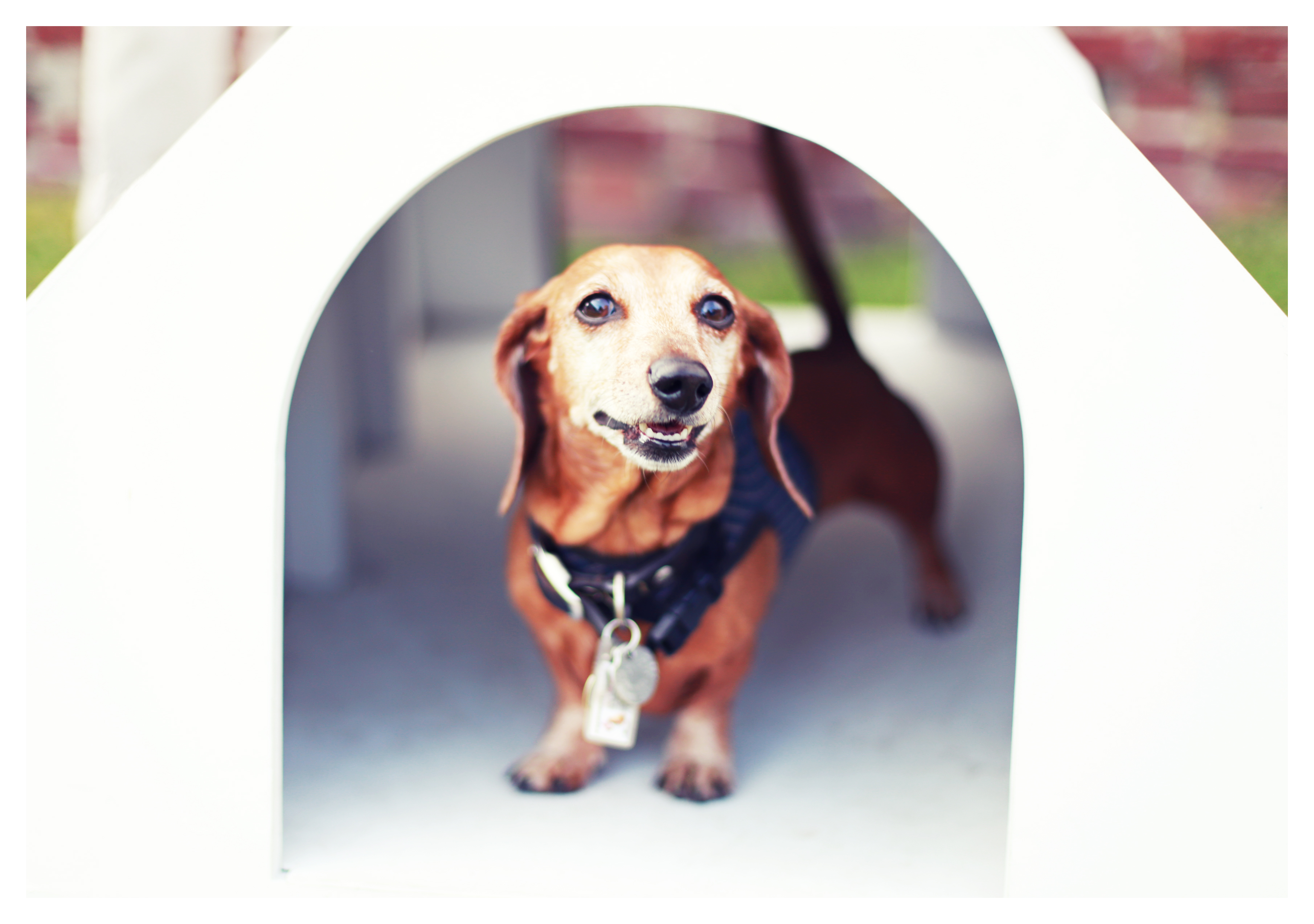 I love that we were able to visit the world-renowned interactive dog-friendly and dog-inspired exhibit Architecture for Dogs twice during its singular US appearance. The exhibit leaves the Long Beach Museum of Art on Sunday (Sept. 1). What I particularly enjoyed about the exhibit was the lawn models out front available for our pooches to try. You could visit the works of art inside, and then test the creations outside with your dog and take pictures as inclined. During Lily’s debut I snapped a few of Rufus trying the D-Tunnel by Kenya Hara and the Beagle House by MVRDV. Emily took a few on her own test try a few months earlier at the opening reception for the exhibit. To see her photos on Facebook click here. I just like today’s photos and consider them fun keepsakes from our travels and adventures. Make it a good one doxie friends, and do something fun with your doxies this weekend. Get out and about together. Enjoy each other.