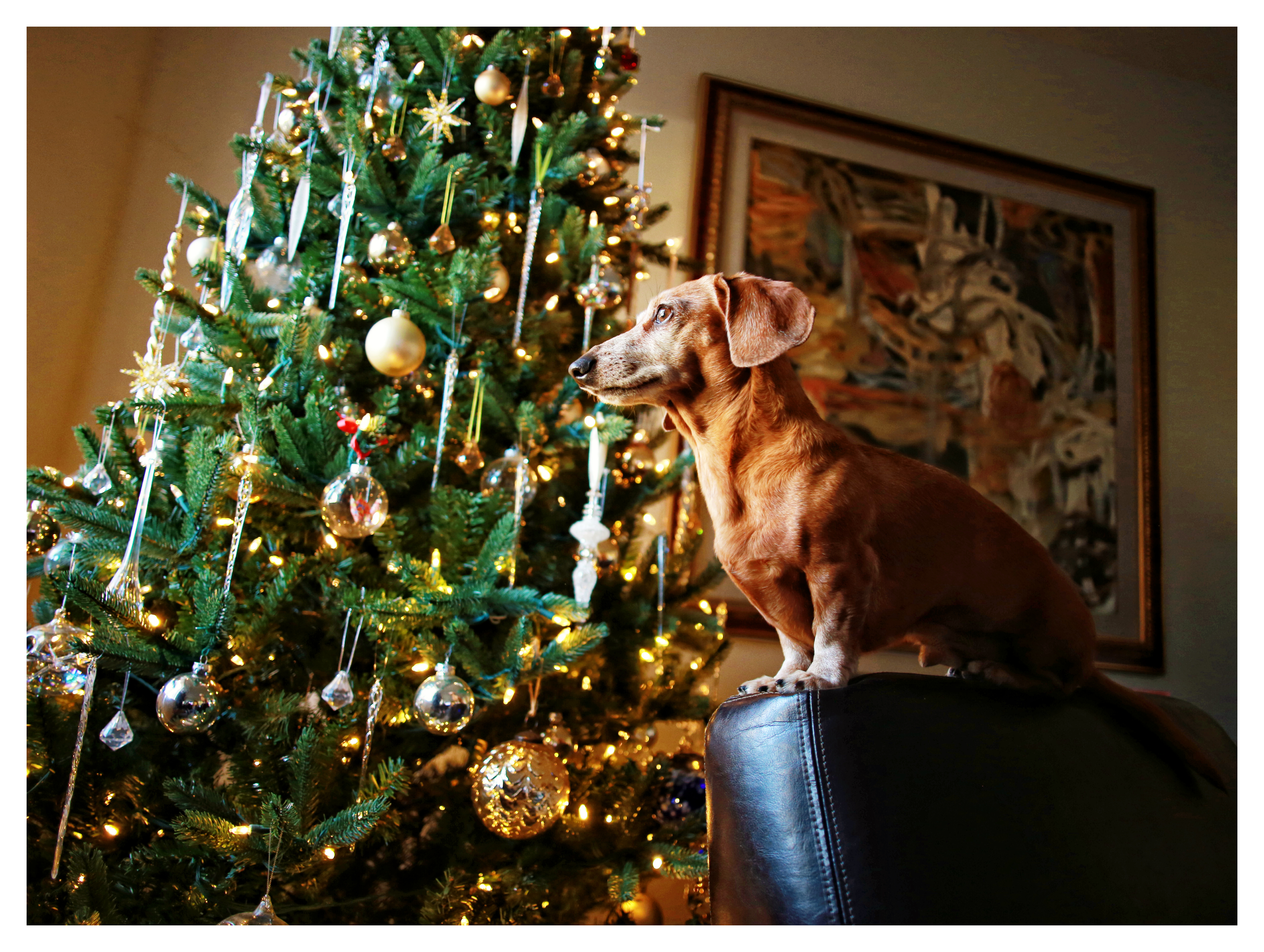 Rufus continues to patiently wait for Santa’s arrival. Unlike the other two, he knows exactly what to expect and can’t wait to tear into those beautifully wrapped boxes. I’m pretty certain he is less concerned with what’s inside and is more eager to enjoy the act of shredding the paper and boxes. Does your dachshund enjoy opening presents?! Wishing you and yours all the best on this Merry Christmas Eve.