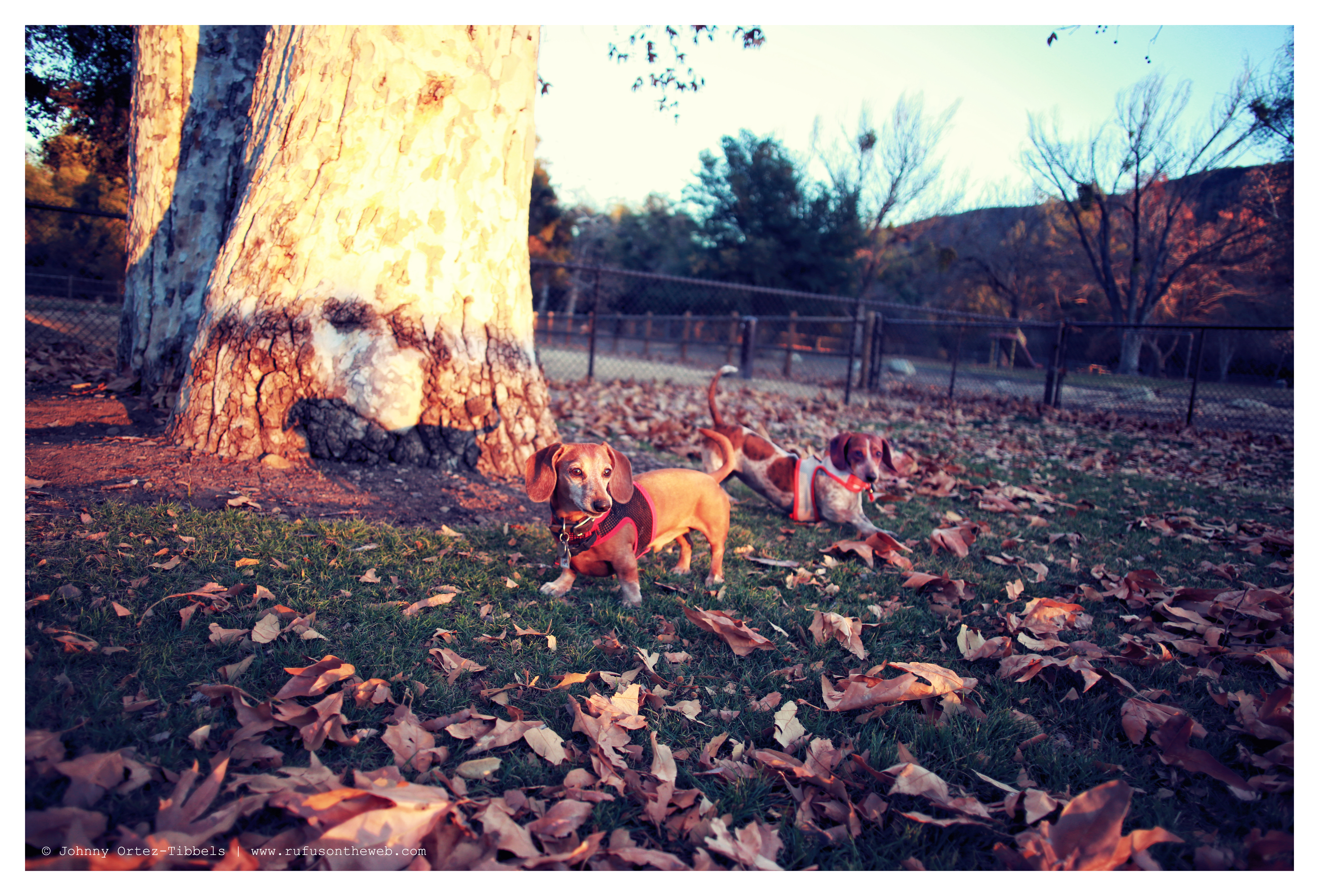 Our 2014 theme is socialization. Today after our afternoon hike, we stopped by the local dog park for a sunset romp in the maple-tree-looking leaves. It was the perfect cool down after our trek, and we happily share some of the pictures with you now. Since the holidays are over, Lucy has re-joined our pack for weekly hikes and other fun excursions to come. Stay tune for more dachshund centric fun friends.
