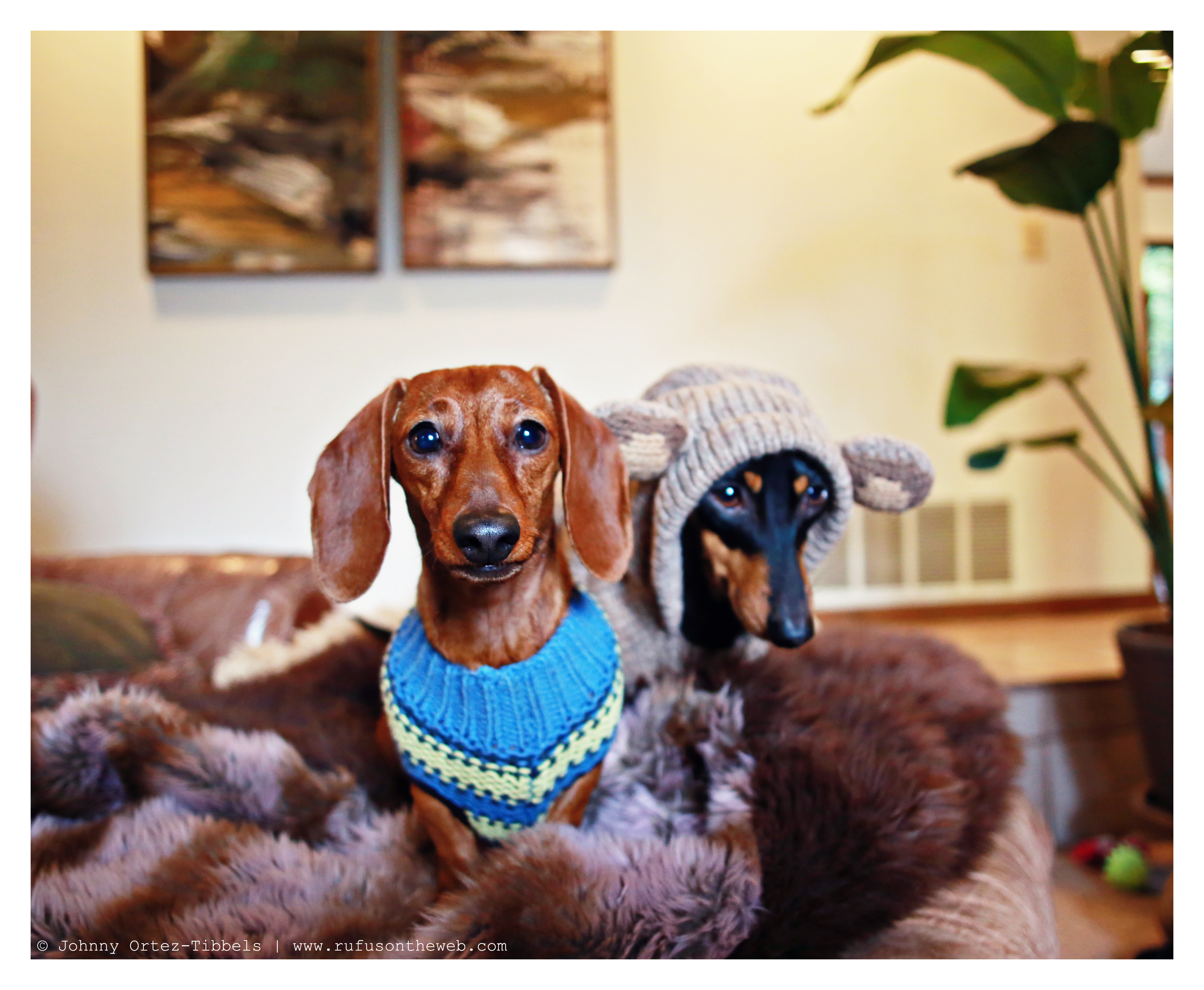 With the rain often comes cooler temperatures. After we come inside from the cold, wet and damp, we dry off and put something on to generate a little added warmth. Here are Emily and Lily in their sweaters keeping warm on a chilly and rainy weekend. Have a wonderful day dachshund friends.