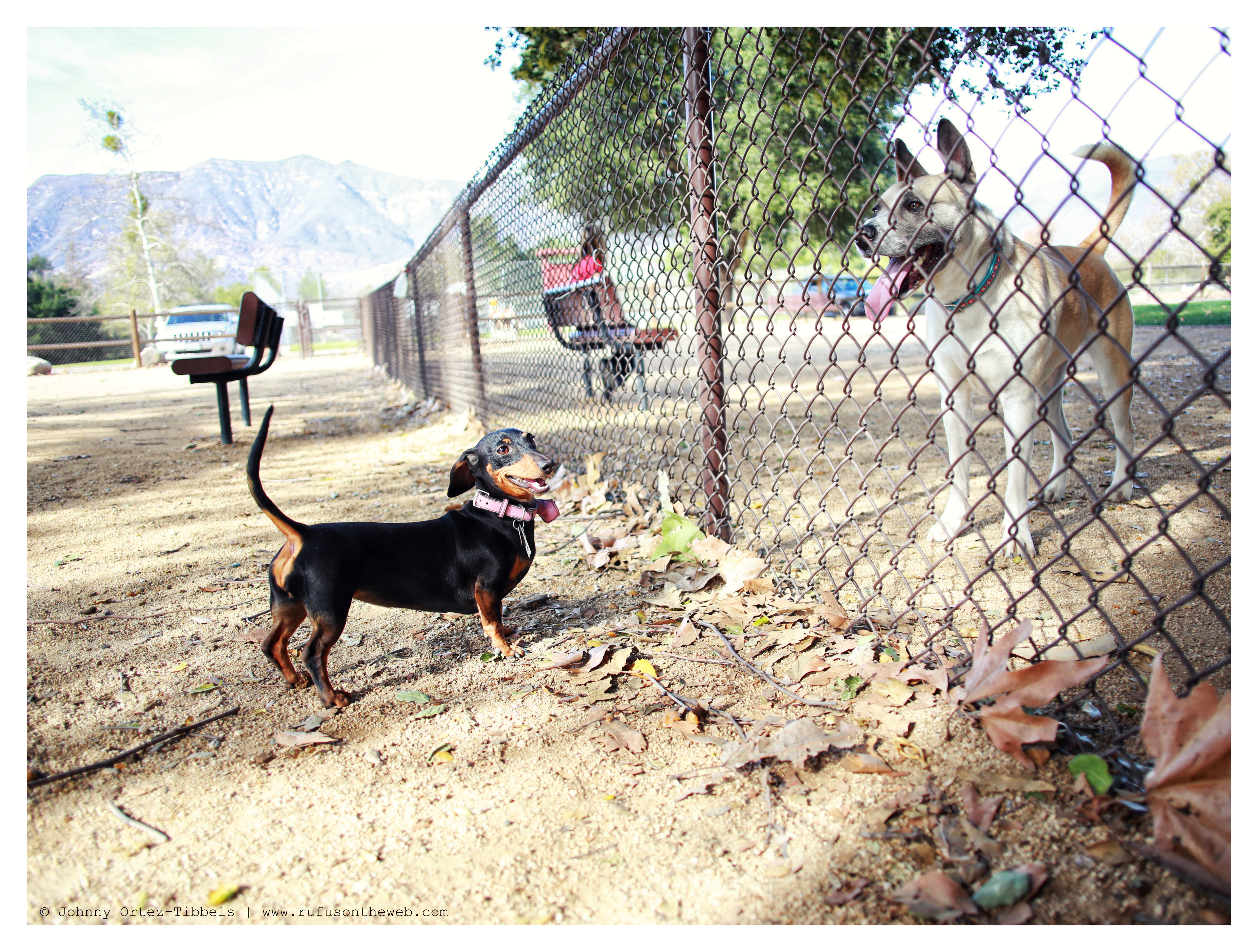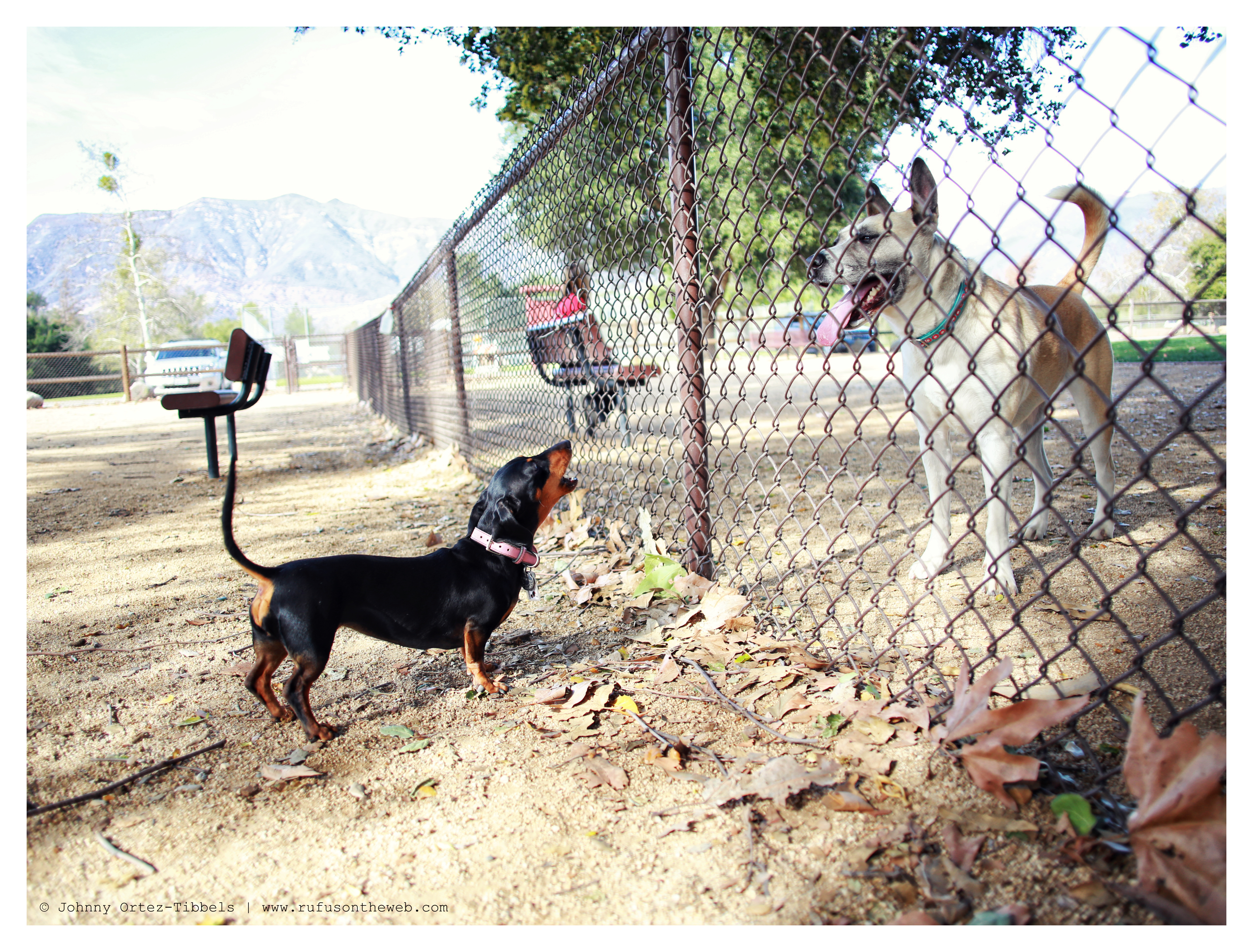 Emily is a barker. She barks when she’s happy; she barks when she’s scared; she barks when she wants to play; and she barks when she is meeting someone new. The barking can be slightly agitating for me personally, but I often try to understand the reason behind the bark. She barks at the back door when she needs to go outside, she barks at the water bowl when she is thirsty and it’s empty. The one time where I just let her bark to her heart’s content is at the dog parks. It never last more a minute or two (at any given time), but she loves to bark at the big dogs opposite the chain-link fence. Her bark does not appear to be mean; it’s not a growl with a lot of teeth and foam, but I imagine her barks are more of a dachshund dialogue. With my active imagination I often speculate that she’s questioning why the dog’s legs are so unusually long. Or if it’s a pretty dog with a nice full and fluffy coat, I imagine Emily is offering her praise. For this particular dog in the photographs, I imagine Emily is asking, “Where did you get that collar?! The colors really suit you.” What do you think she is saying?! Does you dachshund bark!?