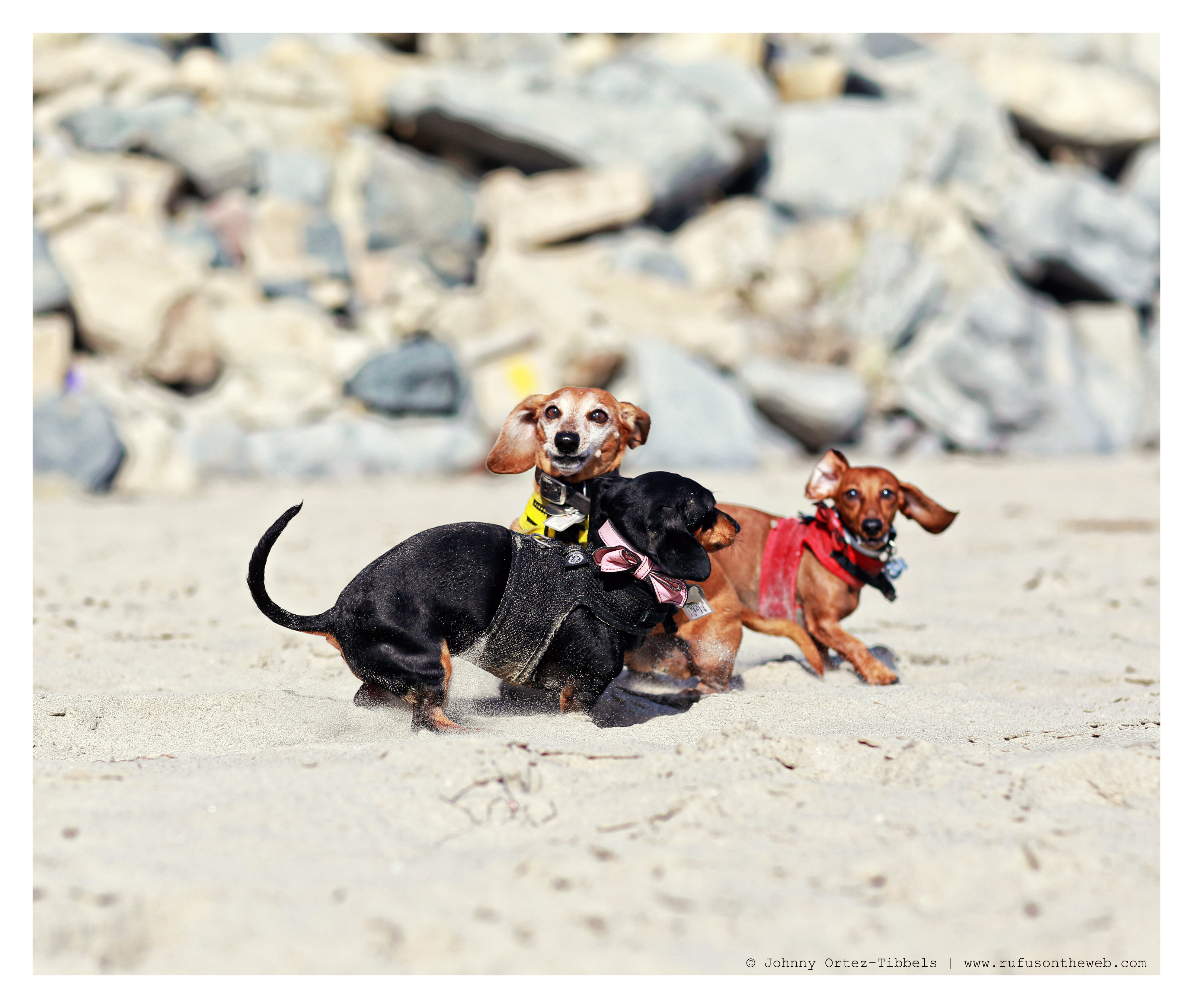 Taking a break from all the preparations for the upcoming DOGS Gallery Show, the pups and I headed to the beach for a little fun in the sand and surf. My dachshund trio really seem to enjoy the beach, especially Summerland. The top photo is my new favorite; it reminds me of a photo finish from a horse race. All three were racing back to me when I snapped it. Have a wonderful day dachshund friends.