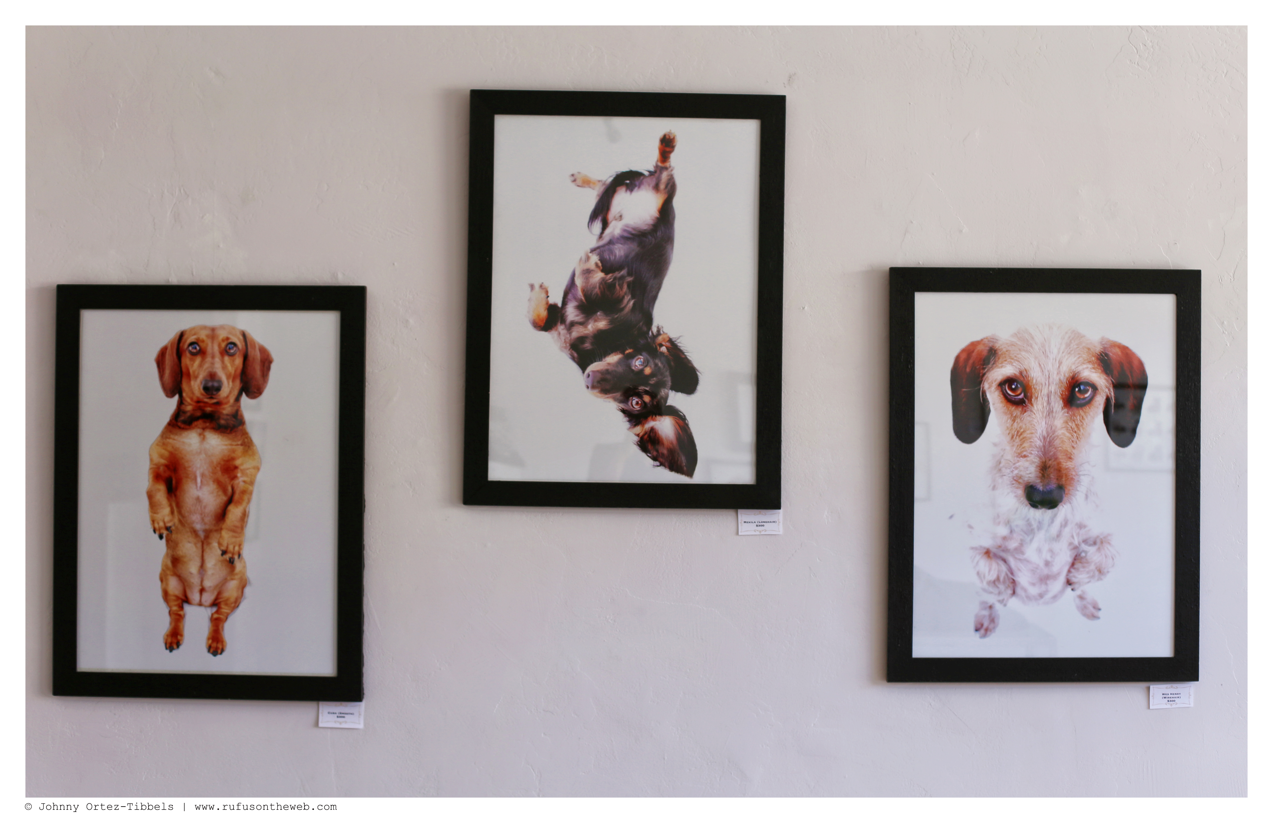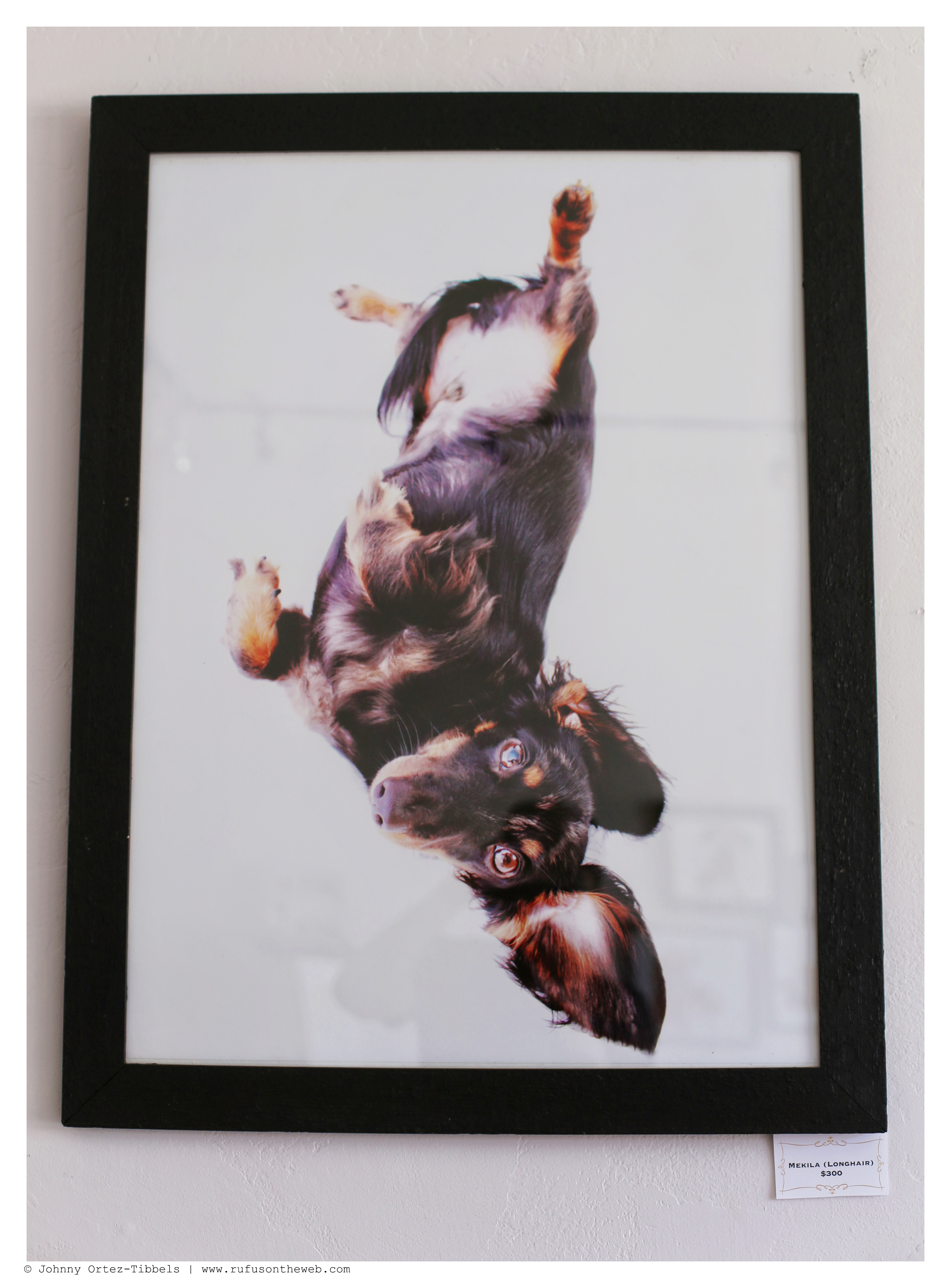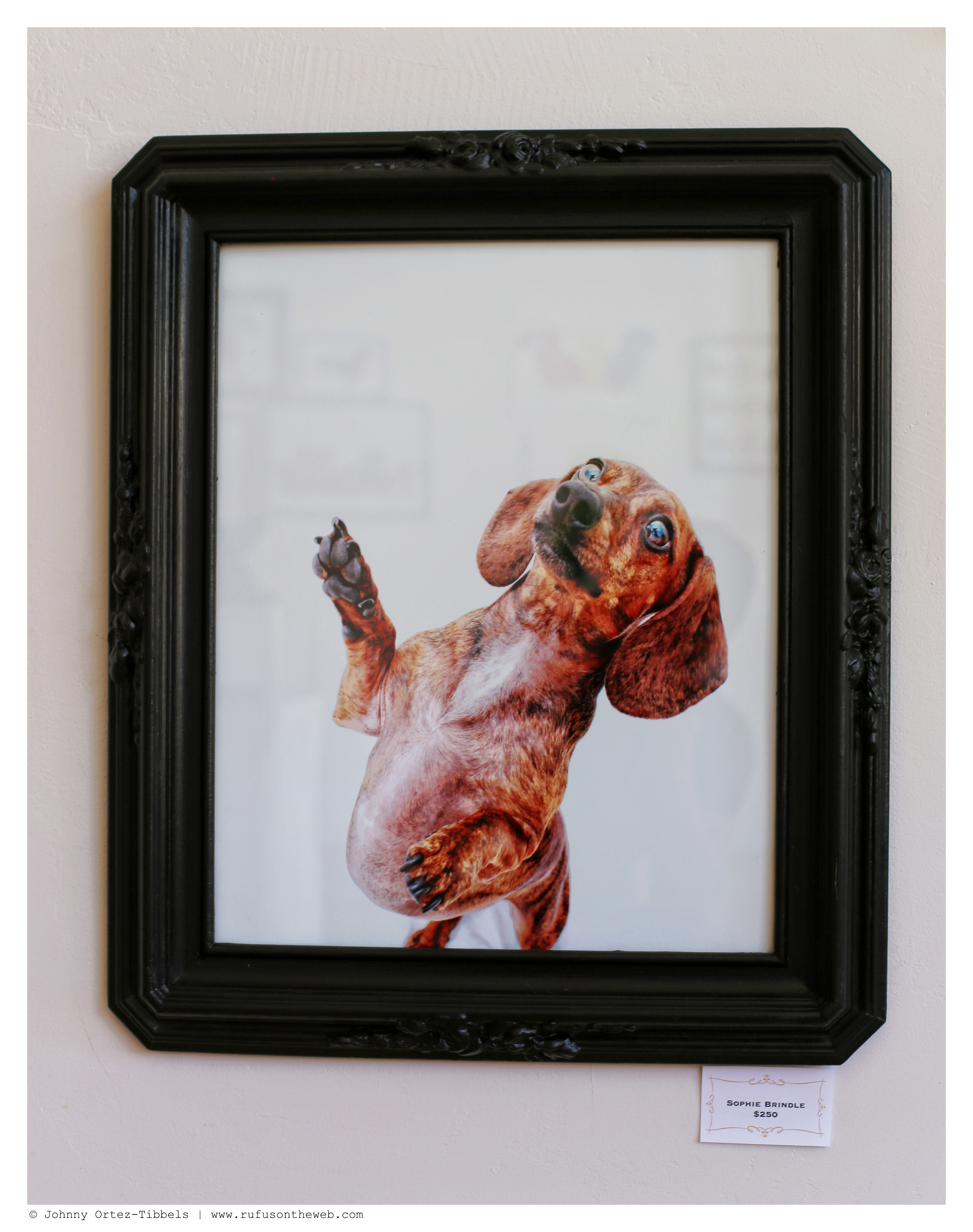 We had two months to prepare for our two-day exhibit of DOGS’ Dachshund Fine Art Photography. In retrospect, I think we’d love to have had a good six months, but it’s always fun to rise to the challenge. From our catalog of hundreds of thousands we selected 20 original images and put them in one-of-a-kind refurbished frames (which is aligned with our motto of recycle, reuse and reclaim). We also had 5 art installments that included: two wood and acrylic ink paintings by our friends at Kapla Art, a DIY Robyn Davis alter, a dachshund duo theme of four watches and a blanket featuring my favorite dachshund trio: Rufus, Emily and Lily. Additionally, we had our book – 102 Dachshunds and our DOGS Summer 2014 tees available for sale. The response was overwhelmingly positive, the turnout was beyond our expectations and several pieces were sold with a few pending sales still lingering. However, we have received many requests on Facebook and here to see the exhibit and to give our online community the chance to purchase so… here you go. We have two categories of art: big (top) and small (bottom) works. We will only be showcasing those pieces still available to purchase, and dimensions will be provided upon request. We’ll also be working to offer more detail on the individual art available for purchase on Facebook (so stay tuned). Here are some highlights from the 2-day celebratory event. Enjoy dachshund friends and thank you for the continued support. The sale will run through Monday, July 7, and all list prices include domestic shipping via UPS. International orders will include an additional shipping fee.