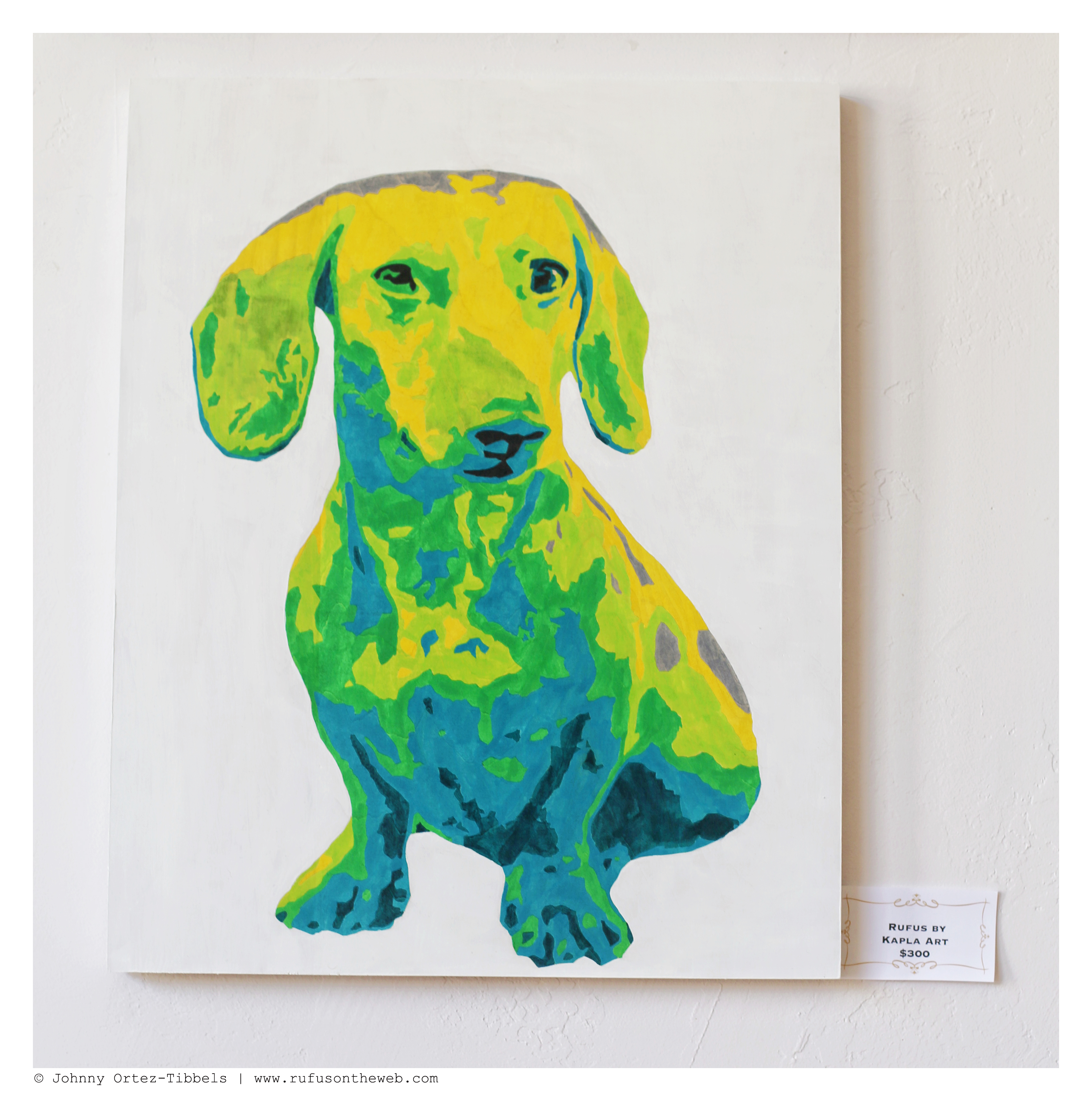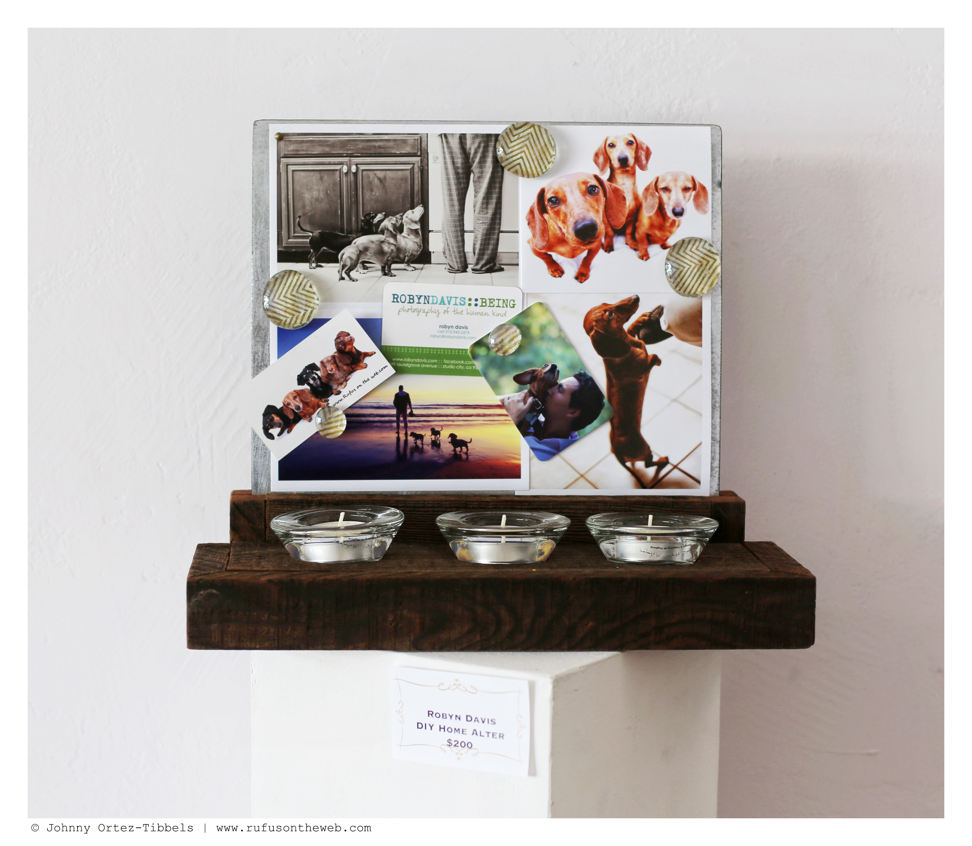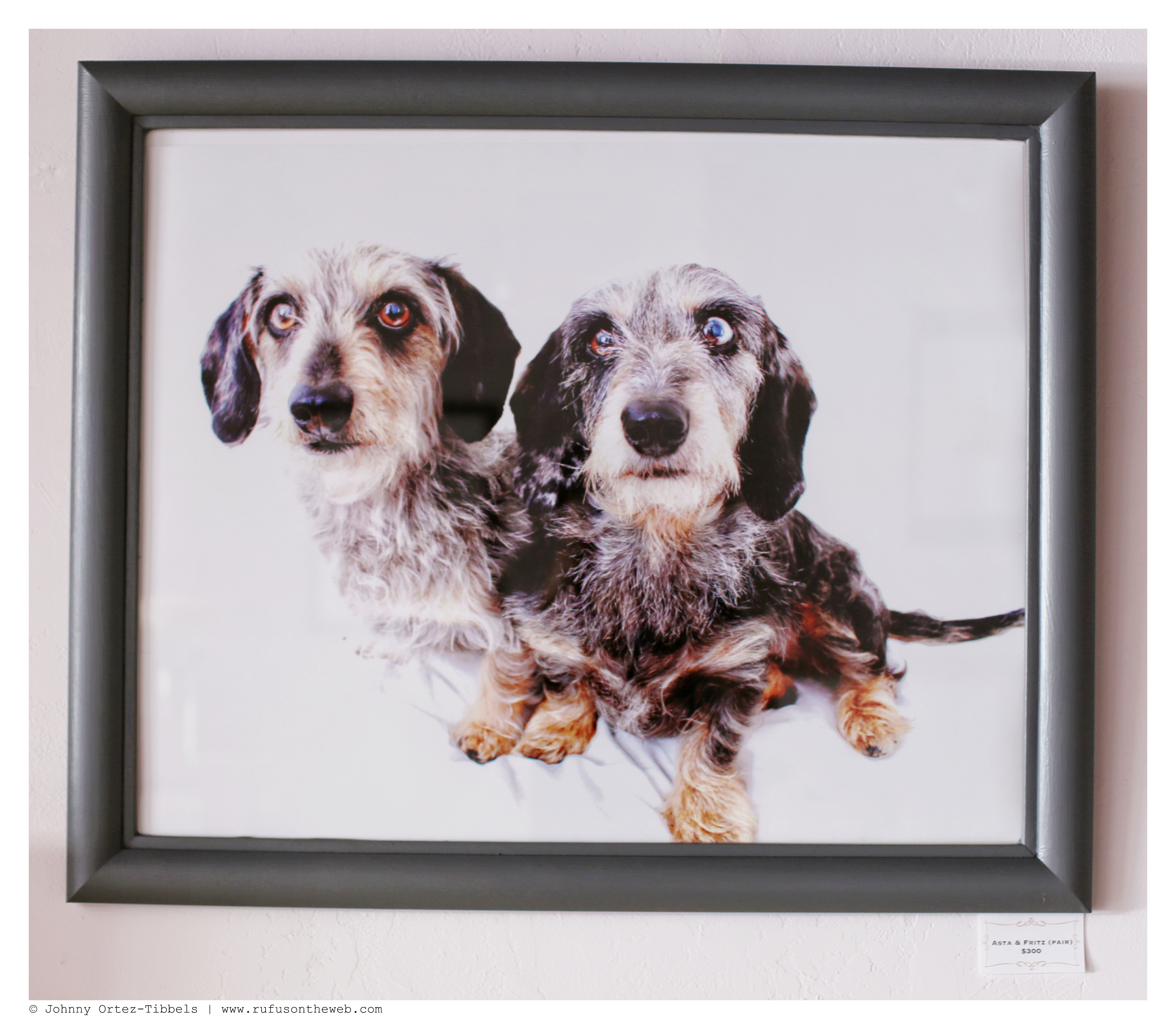 We had two months to prepare for our two-day exhibit of DOGS’ Dachshund Fine Art Photography. In retrospect, I think we’d love to have had a good six months, but it’s always fun to rise to the challenge. From our catalog of hundreds of thousands we selected 20 original images and put them in one-of-a-kind refurbished frames (which is aligned with our motto of recycle, reuse and reclaim). We also had 5 art installments that included: two wood and acrylic ink paintings by our friends at Kapla Art, a DIY Robyn Davis alter, a dachshund duo theme of four watches and a blanket featuring my favorite dachshund trio: Rufus, Emily and Lily. Additionally, we had our book – 102 Dachshunds and our DOGS Summer 2014 tees available for sale. The response was overwhelmingly positive, the turnout was beyond our expectations and several pieces were sold with a few pending sales still lingering. However, we have received many requests on Facebook and here to see the exhibit and to give our online community the chance to purchase so… here you go. We have two categories of art: big (top) and small (bottom) works. We will only be showcasing those pieces still available to purchase, and dimensions will be provided upon request. We’ll also be working to offer more detail on the individual art available for purchase on Facebook (so stay tuned). Here are some highlights from the 2-day celebratory event. Enjoy dachshund friends and thank you for the continued support. The sale will run through Monday, July 7, and all list prices include domestic shipping via UPS. International orders will include an additional shipping fee.