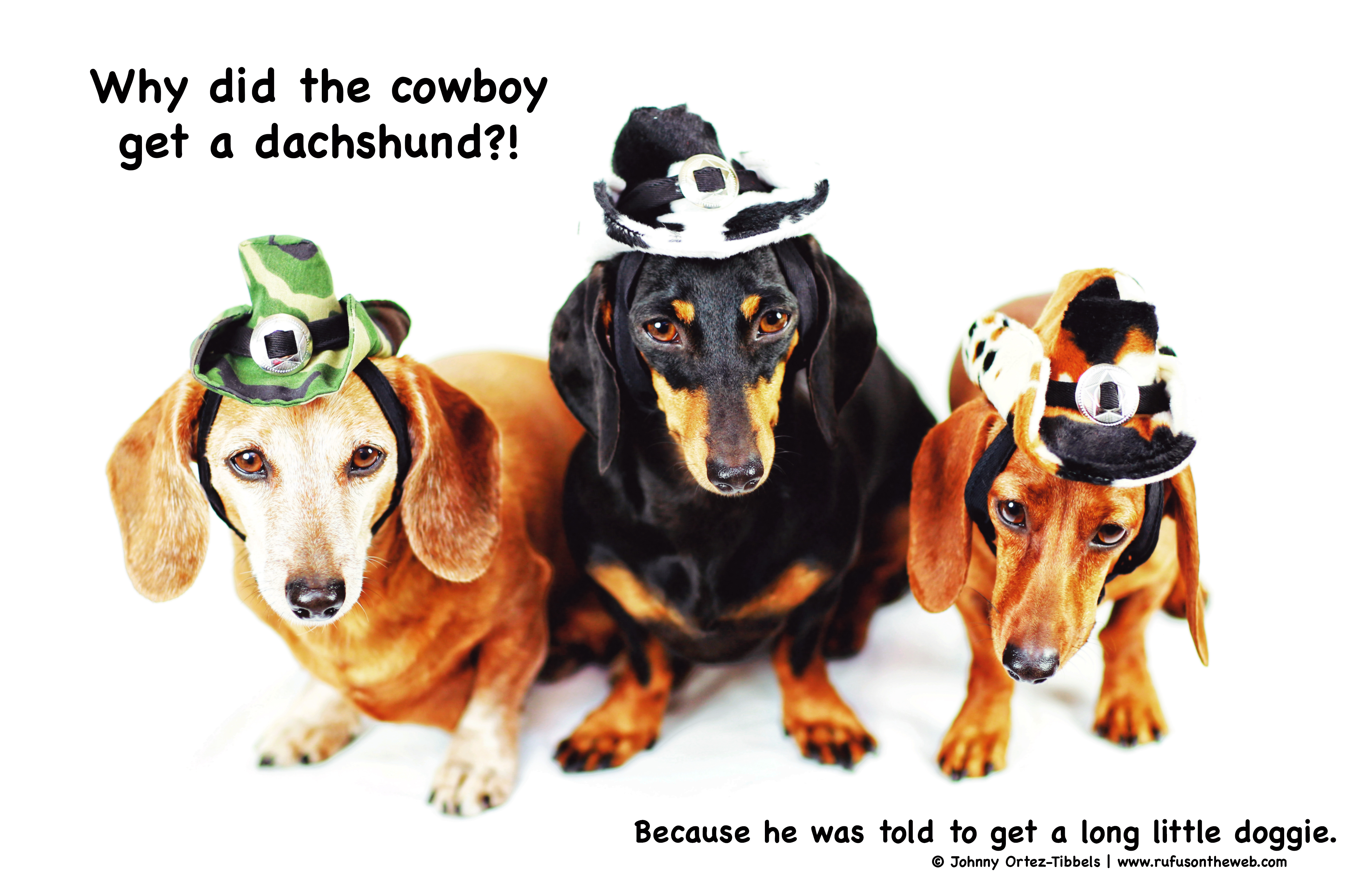Because he was told to get a long little doggie. As a native Texan, I have a strong appreciation for this joke and an affinity for the cowboy hats courtesy of our friends at K9 Kool Hats. Check them out dachshund friends, and if you get one for your long little doggie, let them know Rufus and friends sent you. Enjoy the photos dachshund friends.