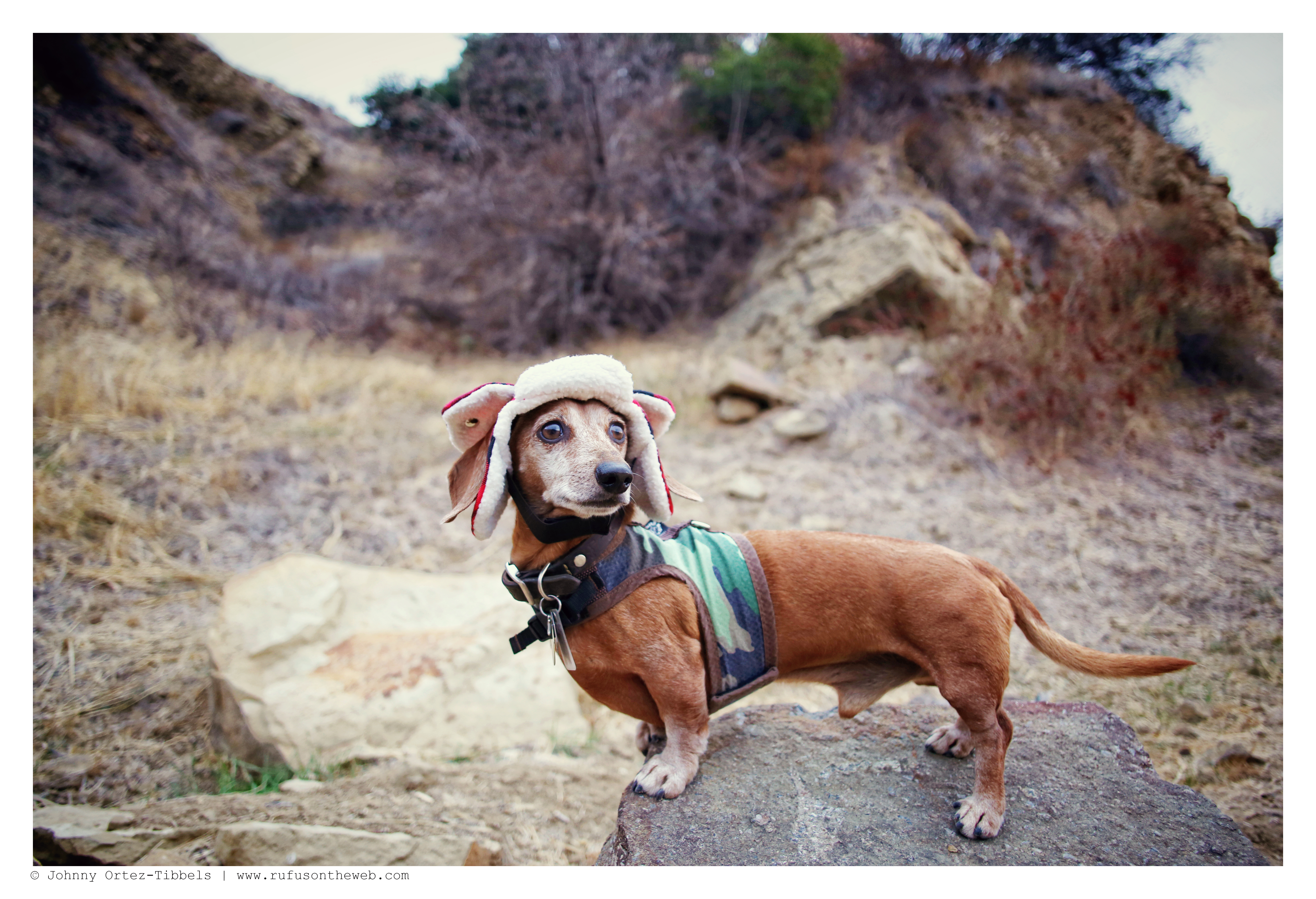 Today’s featured photos are affectionately called Lumberjack Rufus. Rufus in his camouflage hug-a-dog harness and red plaid hunting hat is so on trend and seasonally appropriate for our weekly hikes. My dachshunds truly dress for the occasion, whatever it may be. Have great one dachshund friends.