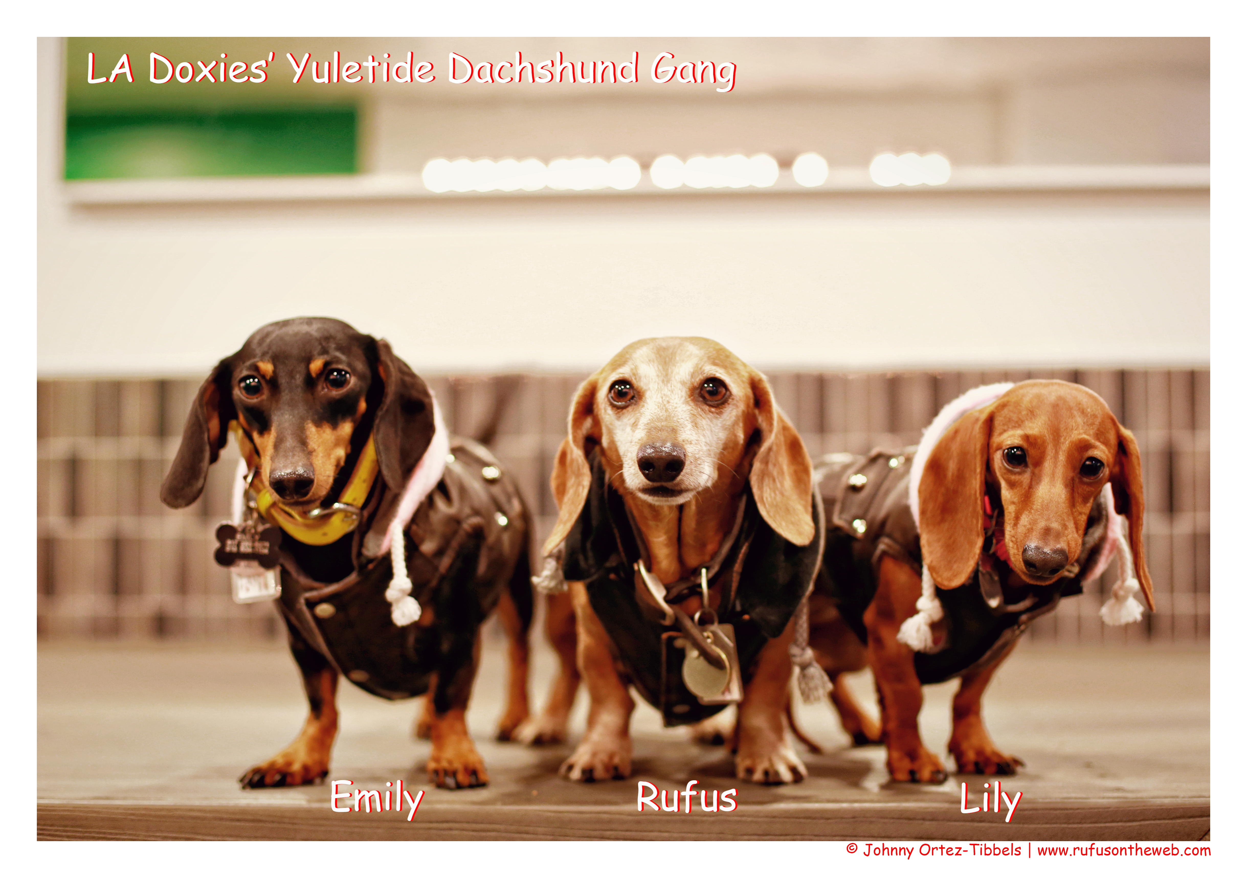 The top photo features Rufus, Emily and Lily in their matching faux leather bomber jackets with hoods. They were the Yuletide Doxie Gang bringing holiday cheer everywhere they went Sunday.