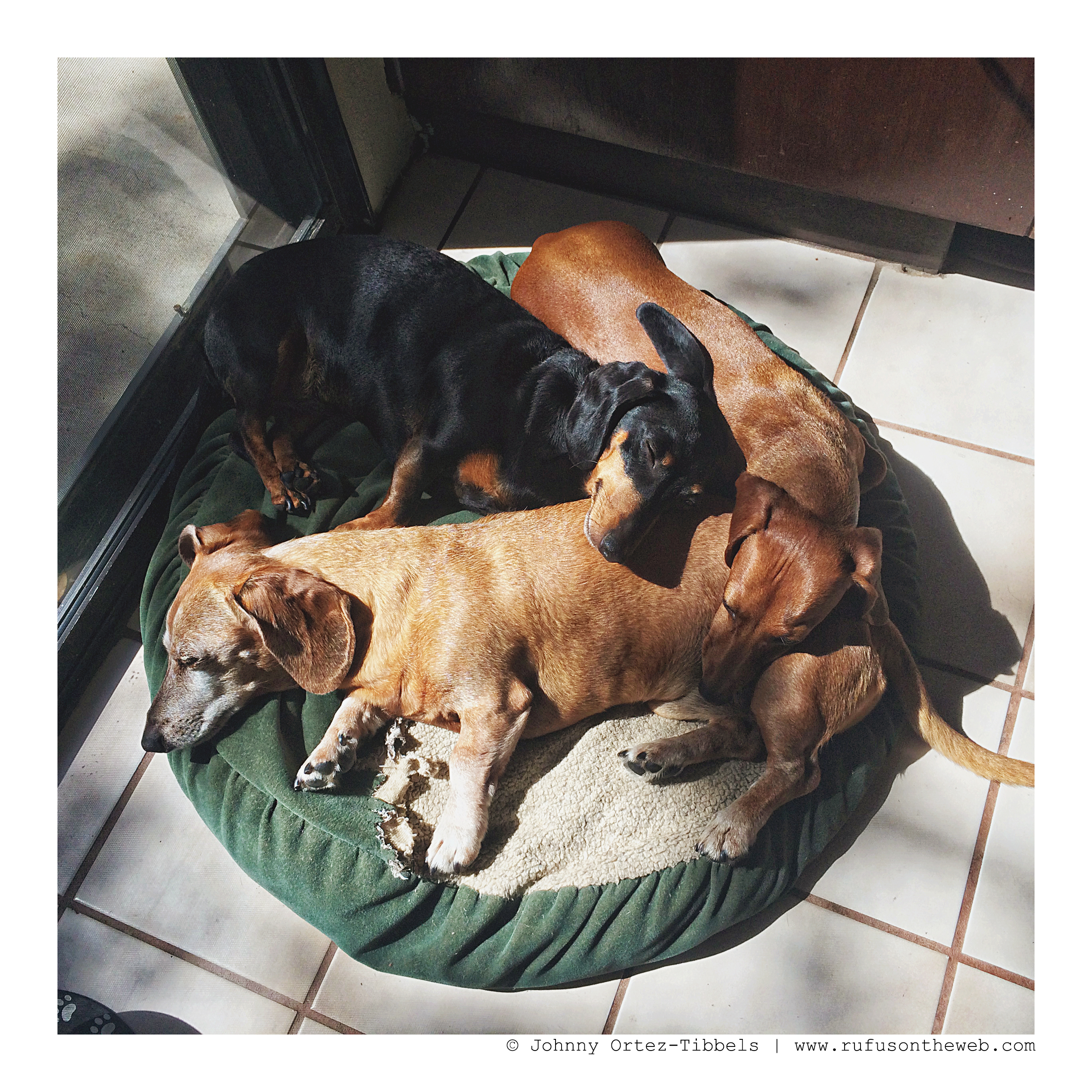 It truly warms the human heart when I happen to walk into the kitchen and find all three dachshunds piled up together basking in the warm rays of sun. To me that’s the look of genuine unconditional love. These three little sausage hounds really brighten my day by simply being them. No matter what hectic things are happening each day, when I stumble across this pile of cuteness, I immediately smile big and experience this wash of warm sentiment all over. Living with dachshunds is really a unique and remarkable event. Anyone living with dachshunds (or dogs) knows exactly what I’m talking about. Happy hounds equal happy humans. The presents of cute canines surely enhances the quality of life for all of those around them. Have a wonderful week friends, and enjoy the photos.